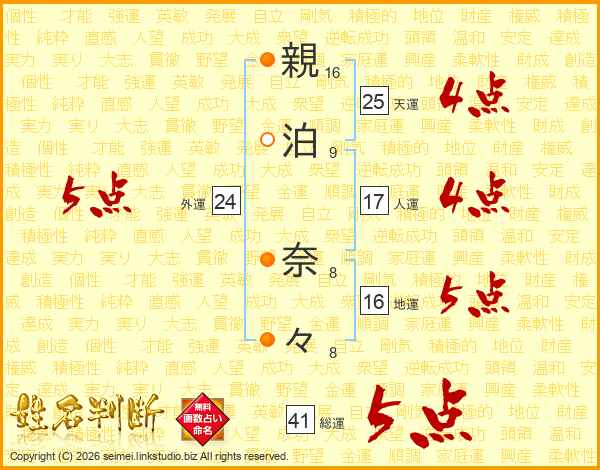 親(16画)泊(9画) 奈(8画)々(8画)