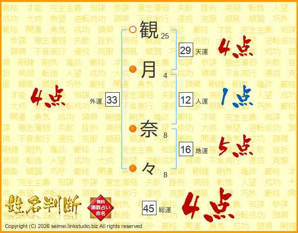 観(25画)月(4画) 奈(8画)々(8画)