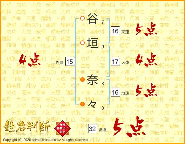 谷(7画)垣(9画) 奈(8画)々(8画)
