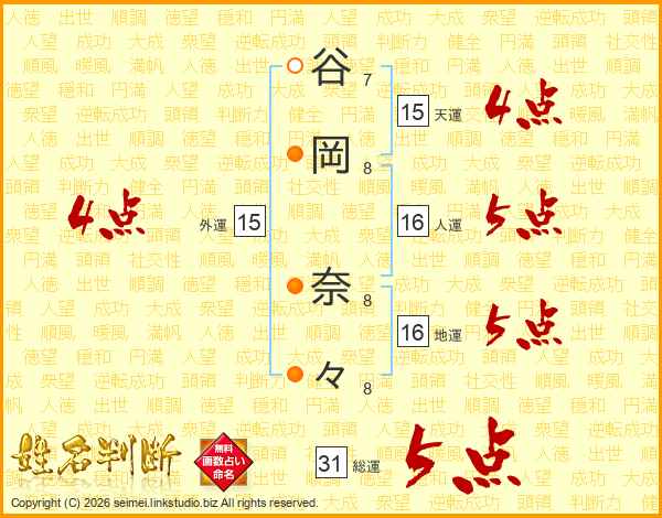 谷(7画)岡(8画) 奈(8画)々(8画)