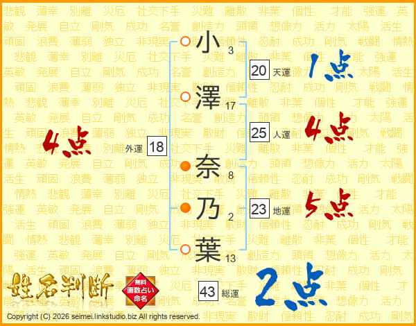 小(3画)澤(17画) 奈(8画)乃(2画)葉(13画)