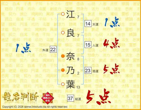 江(7画)良(7画) 奈(8画)乃(2画)葉(13画)