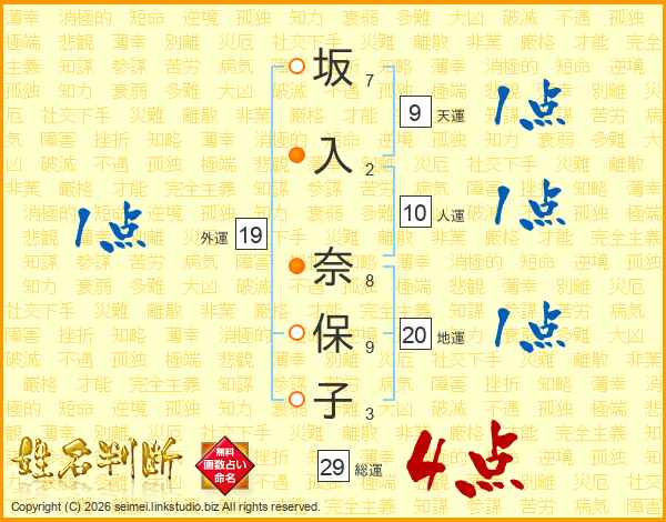 坂(7画)入(2画) 奈(8画)保(9画)子(3画)