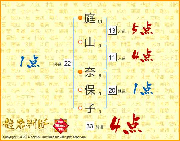 庭(10画)山(3画) 奈(8画)保(9画)子(3画)