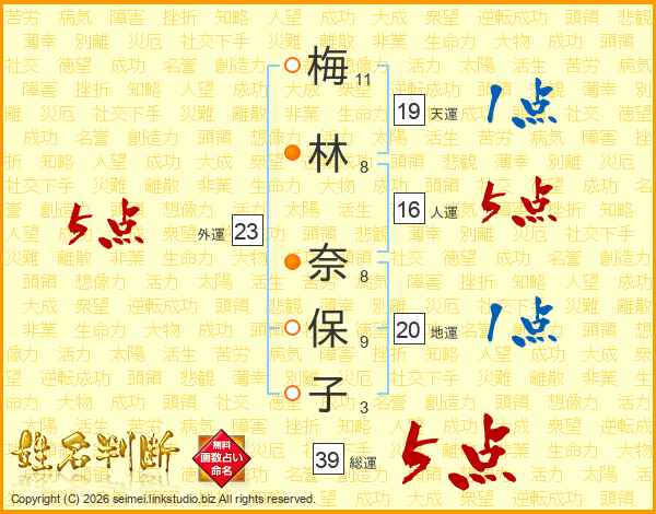 梅(11画)林(8画) 奈(8画)保(9画)子(3画)