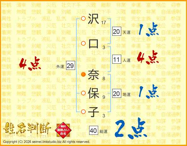 沢(17画)口(3画) 奈(8画)保(9画)子(3画)