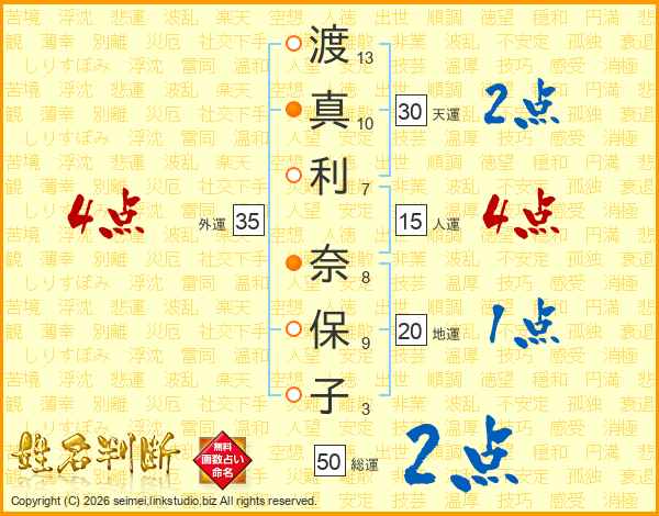 渡(13画)真(10画)利(7画) 奈(8画)保(9画)子(3画)