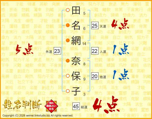 田(5画)名(6画)網(14画) 奈(8画)保(9画)子(3画)