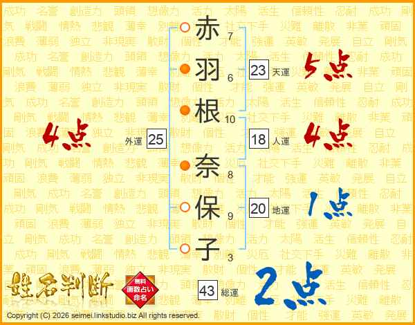 赤羽根奈保子さんの総運は43画の2点!