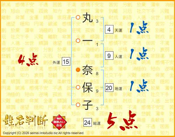 丸(3画)一(1画) 奈(8画)保(9画)子(3画)