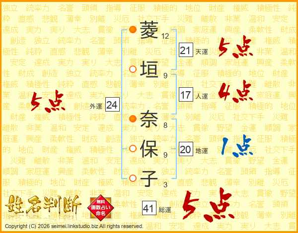 菱(12画)垣(9画) 奈(8画)保(9画)子(3画)