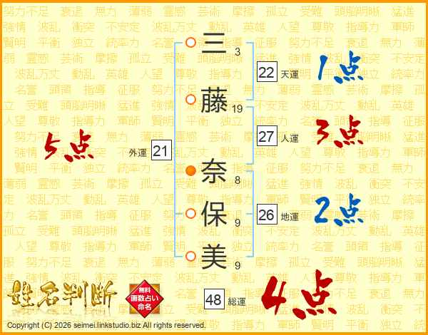 三(3画)藤(19画) 奈(8画)保(9画)美(9画)