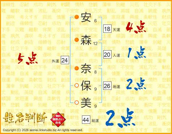 安(6画)森(12画) 奈(8画)保(9画)美(9画)