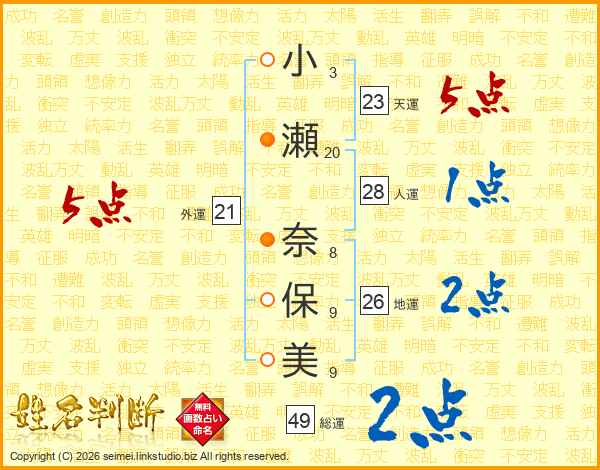 小瀬奈保美さんの総運は49画の2点!