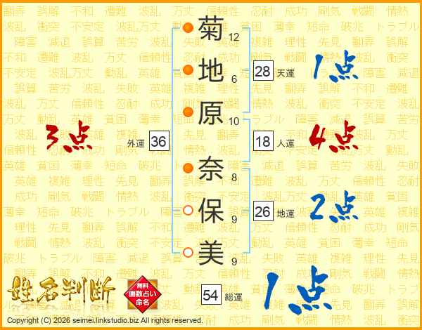 菊(12画)地(6画)原(10画) 奈(8画)保(9画)美(9画)