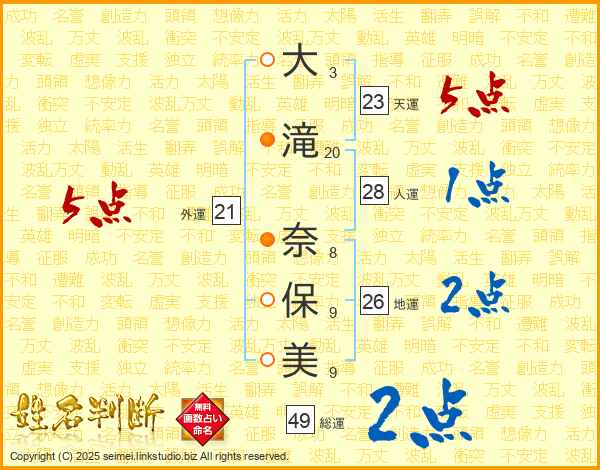 大(3画)滝(20画) 奈(8画)保(9画)美(9画)