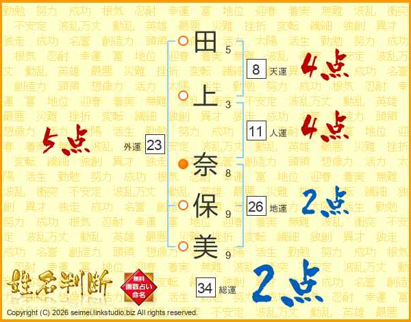 田(5画)上(3画) 奈(8画)保(9画)美(9画)