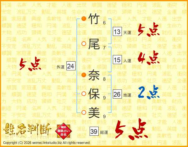 竹尾奈保美さんの総運は39画の5点!