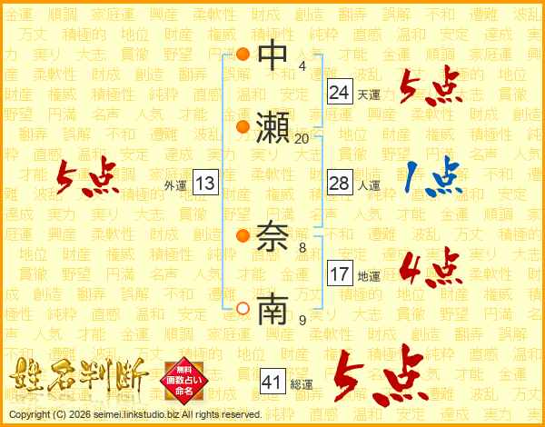 中(4画)瀬(20画) 奈(8画)南(9画)