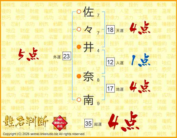 佐(7画)々(7画)井(4画) 奈(8画)南(9画)