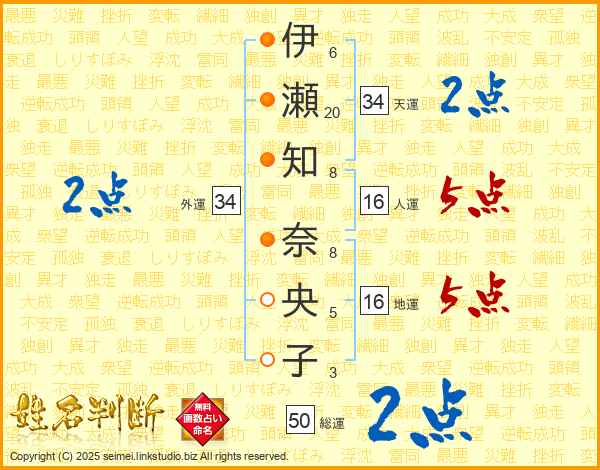 伊(6画)瀬(20画)知(8画) 奈(8画)央(5画)子(3画)