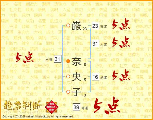 巌(23画) 奈(8画)央(5画)子(3画)