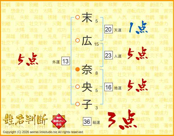 末(5画)広(15画) 奈(8画)央(5画)子(3画)