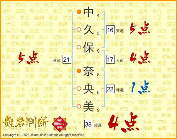 中(4画)久(3画)保(9画) 奈(8画)央(5画)美(9画)