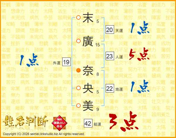 末(5画)廣(15画) 奈(8画)央(5画)美(9画)