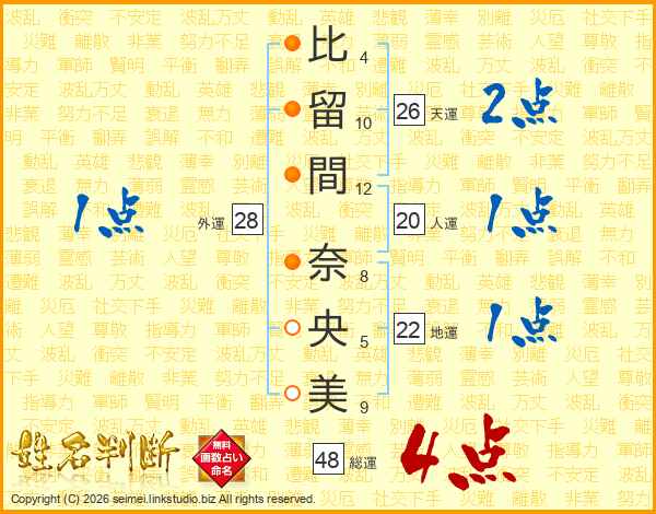 比(4画)留(10画)間(12画) 奈(8画)央(5画)美(9画)
