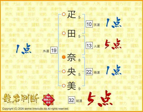 生活面を象徴する運勢です。外部から受ける影響力を表し、結婚運、家庭運や職場、環境への順応性を表します。総運から人運を引いた画数。姓や名が1文字の場合を除く。