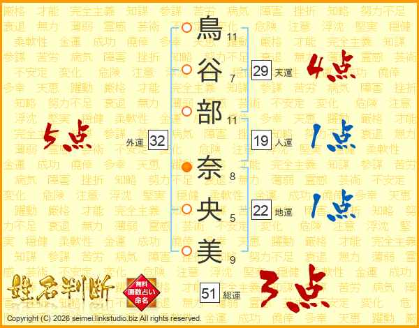 鳥(11画)谷(7画)部(11画) 奈(8画)央(5画)美(9画)