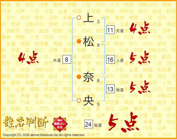 上(3画)松(8画) 奈(8画)央(5画)