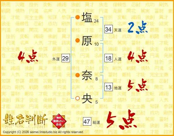 塩(24画)原(10画) 奈(8画)央(5画)