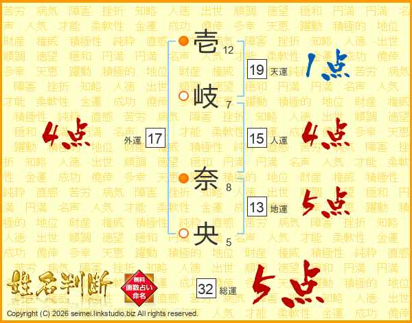 壱(12画)岐(7画) 奈(8画)央(5画)