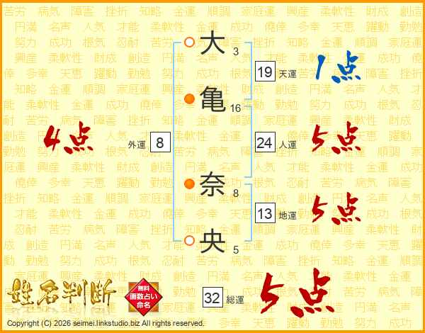 生活面を象徴する運勢です。外部から受ける影響力を表し、結婚運、家庭運や職場、環境への順応性を表します。総運から人運を引いた画数。姓や名が1文字の場合を除く。