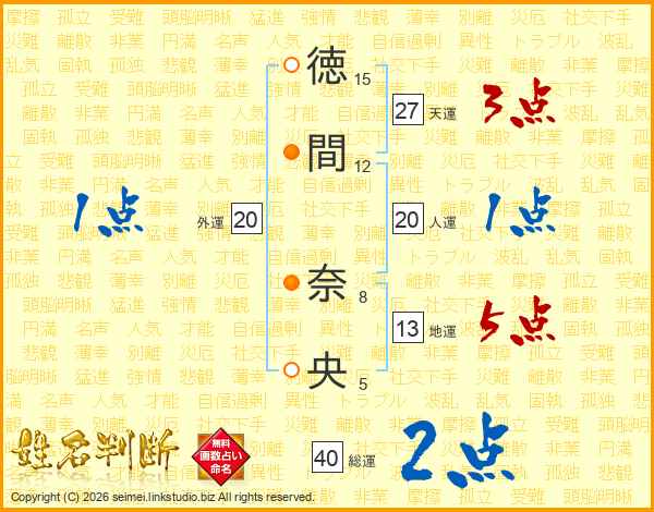 徳(15画)間(12画) 奈(8画)央(5画)