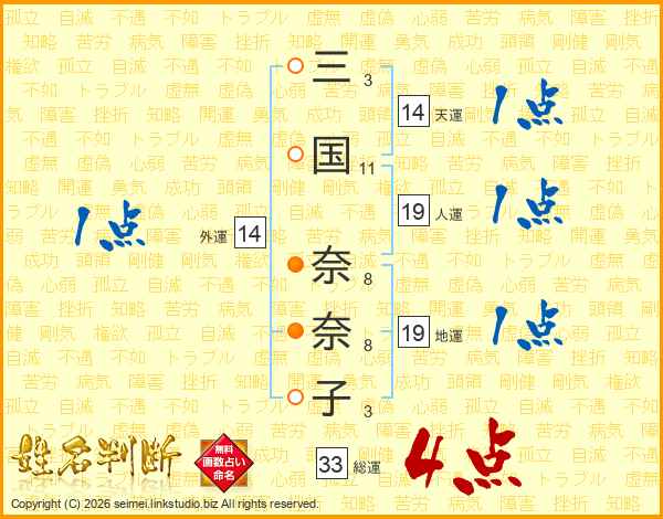 三(3画)国(11画) 奈(8画)奈(8画)子(3画)
