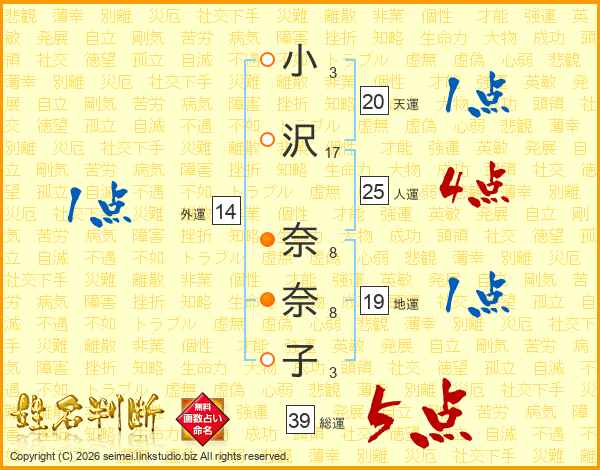 小(3画)沢(17画) 奈(8画)奈(8画)子(3画)