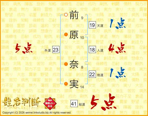 生活面を象徴する運勢です。外部から受ける影響力を表し、結婚運、家庭運や職場、環境への順応性を表します。総運から人運を引いた画数。姓や名が1文字の場合を除く。