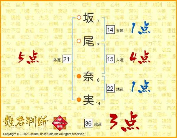 坂(7画)尾(7画) 奈(8画)実(14画)