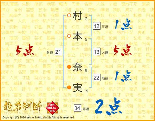 生活面を象徴する運勢です。外部から受ける影響力を表し、結婚運、家庭運や職場、環境への順応性を表します。総運から人運を引いた画数。姓や名が1文字の場合を除く。