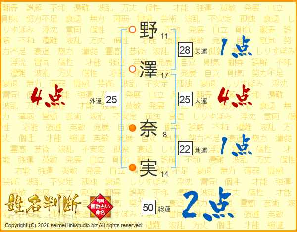 野(11画)澤(17画) 奈(8画)実(14画)