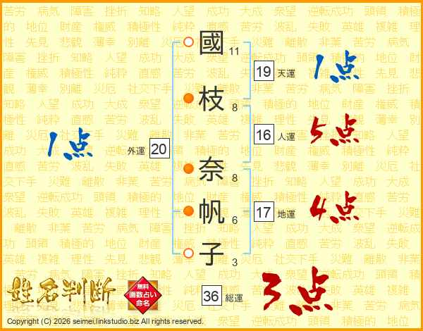 國(11画)枝(8画) 奈(8画)帆(6画)子(3画)