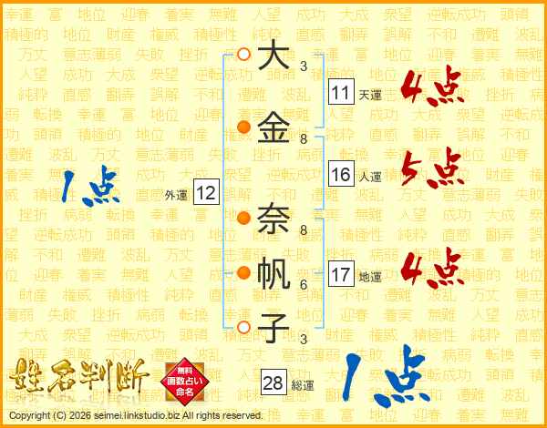 大(3画)金(8画) 奈(8画)帆(6画)子(3画)