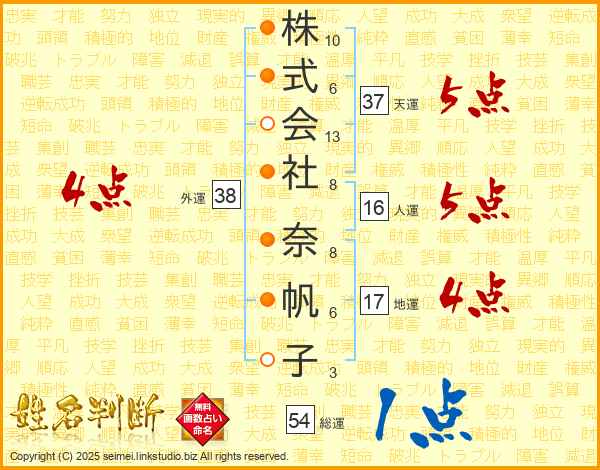 株(10画)式(6画)会(13画)社(8画) 奈(8画)帆(6画)子(3画)
