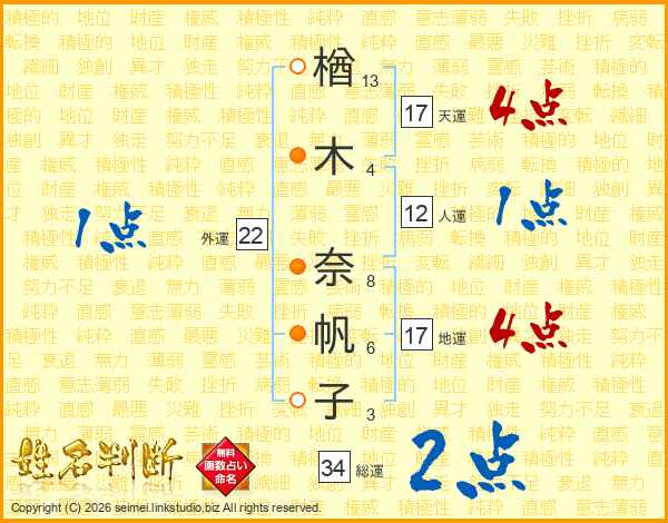 楢(13画)木(4画) 奈(8画)帆(6画)子(3画)