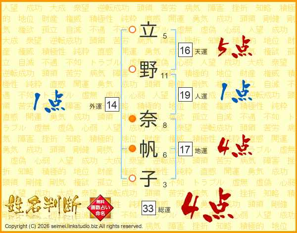 立(5画)野(11画) 奈(8画)帆(6画)子(3画)