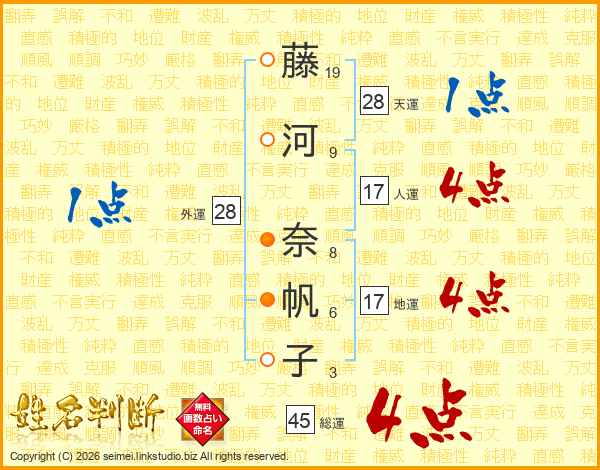 藤(19画)河(9画) 奈(8画)帆(6画)子(3画)