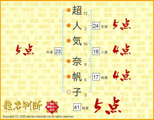 超(12画)人(2画)気(10画) 奈(8画)帆(6画)子(3画)